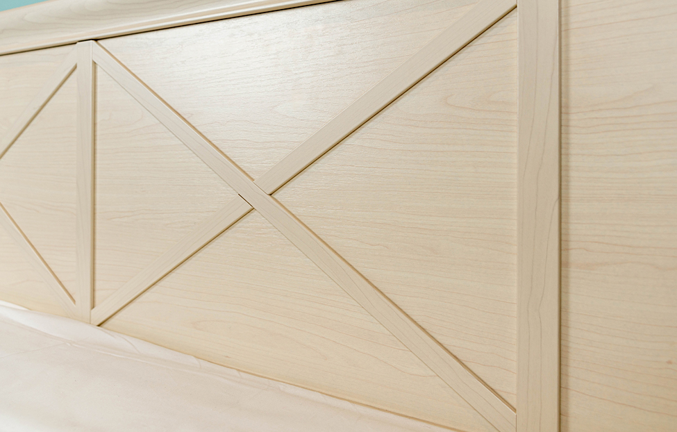 - Накладка-фахверк на спинке — из профиля МДФ в цвет ЛДСП спинки (с видимым пересечением в месте соединения);