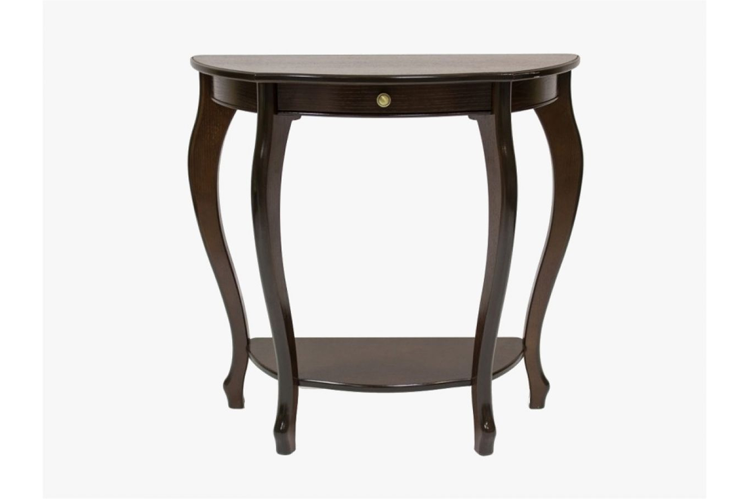 Столешница полукруглой формы выполнена из прочного, износостойкого МДФ, основание — из натуральной древесины. Лакированное глянцевое покрытие смотрится изысканно и благородно, фигурные ножки подчеркивают элегантность изделия. Широкий выдвижной ящик снабжен точечной круглой ручкой, декорированной «под золото».